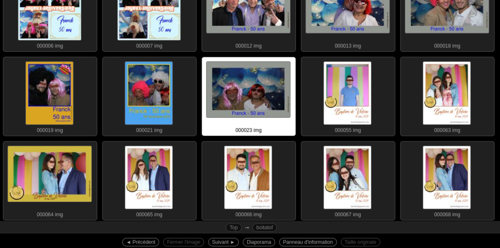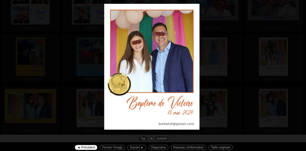 Vous avez passé un bon moment? Vos invités se sont fait tirer le portrait? Chacun, a pu imprimer ses photos. Génial, mais la fête continue, vous allez recevoir un lien vers votre galerie photo personnelle, avec mot de passe. Partagez ce lien avec vos invités, pour explorer toutes les photos. Trois dossiers vous sont livrés: